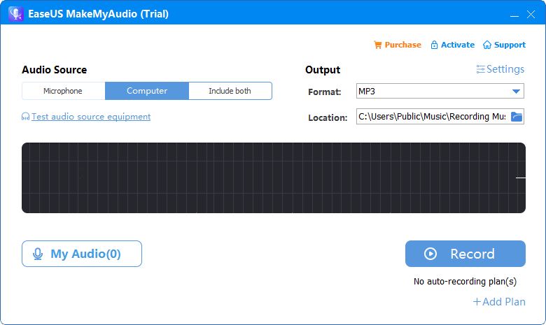 MakeMyAudio разработана компанией EaseUS как многофункциональный инструмент для работы с аудиоданными. Программа позволяет записывать звук, проходящий через аудиоустройства компьютера, включая воспроизведение музыки, голос из звонков, игры и другие источники. Она поддерживает работу с популярными форматами, такими как MP3, WAV, WMA, а также извлечение звука из видеороликов, что делает её универсальным решением для обработки аудиоконтента.