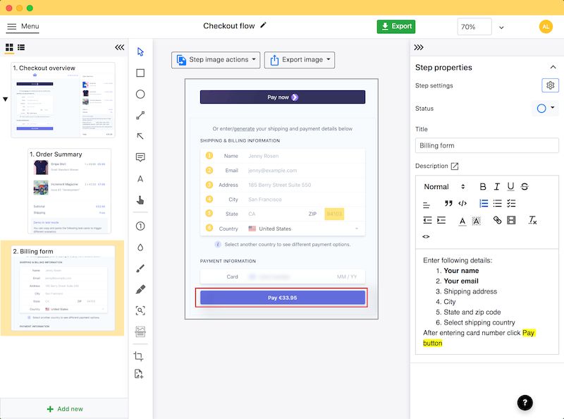Использование программы начинается с запуска экранного диктофона и выбора области захвата. Как только пользователь начинает выполнять нужные действия, Folge автоматически фиксирует каждый шаг, делая скриншоты и помечая интерактивные элементы. После завершения процесса все снимки можно импортировать в редактор, где доступна детальная настройка. Каждому шагу можно присвоить заголовок, добавить пояснительный текст, нумерацию и графические акценты. Программа поддерживает гибкое управление порядком шагов, замену изображений и обрезку по необходимости. Экспорт завершает процесс — пользователь получает готовый документ в удобном формате.