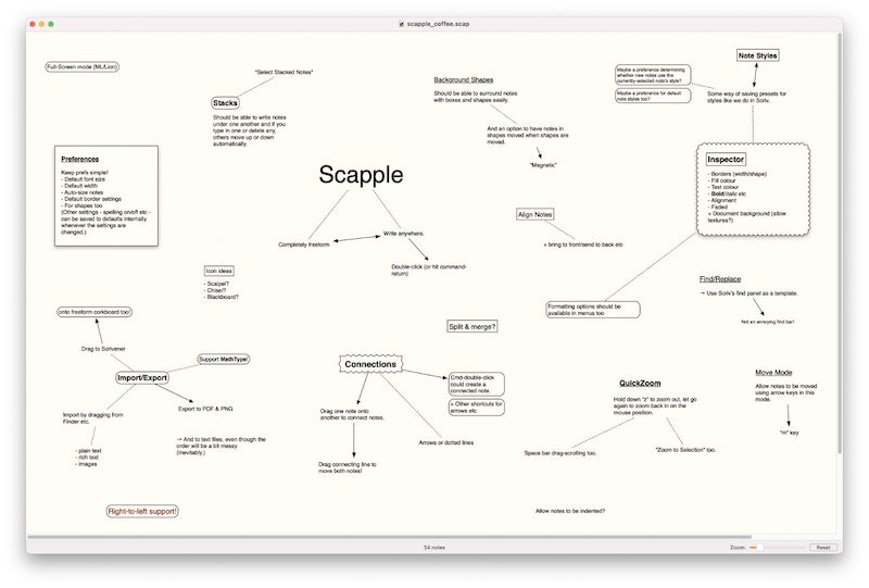Scapple разработан как свободная среда для записи и соединения идей, не требующая предварительного планирования структуры. В отличие от типичных программ для построения карт ума, она не заставляет начинать с центральной темы или следовать строгим правилам построения. Каждая заметка становится отдельным элементом, который можно размещать в любом месте экрана, соединяя идеи по мере их возникновения. Эта гибкость делает Scapple привлекательным инструментом для тех, кто ценит естественный ход мышления.