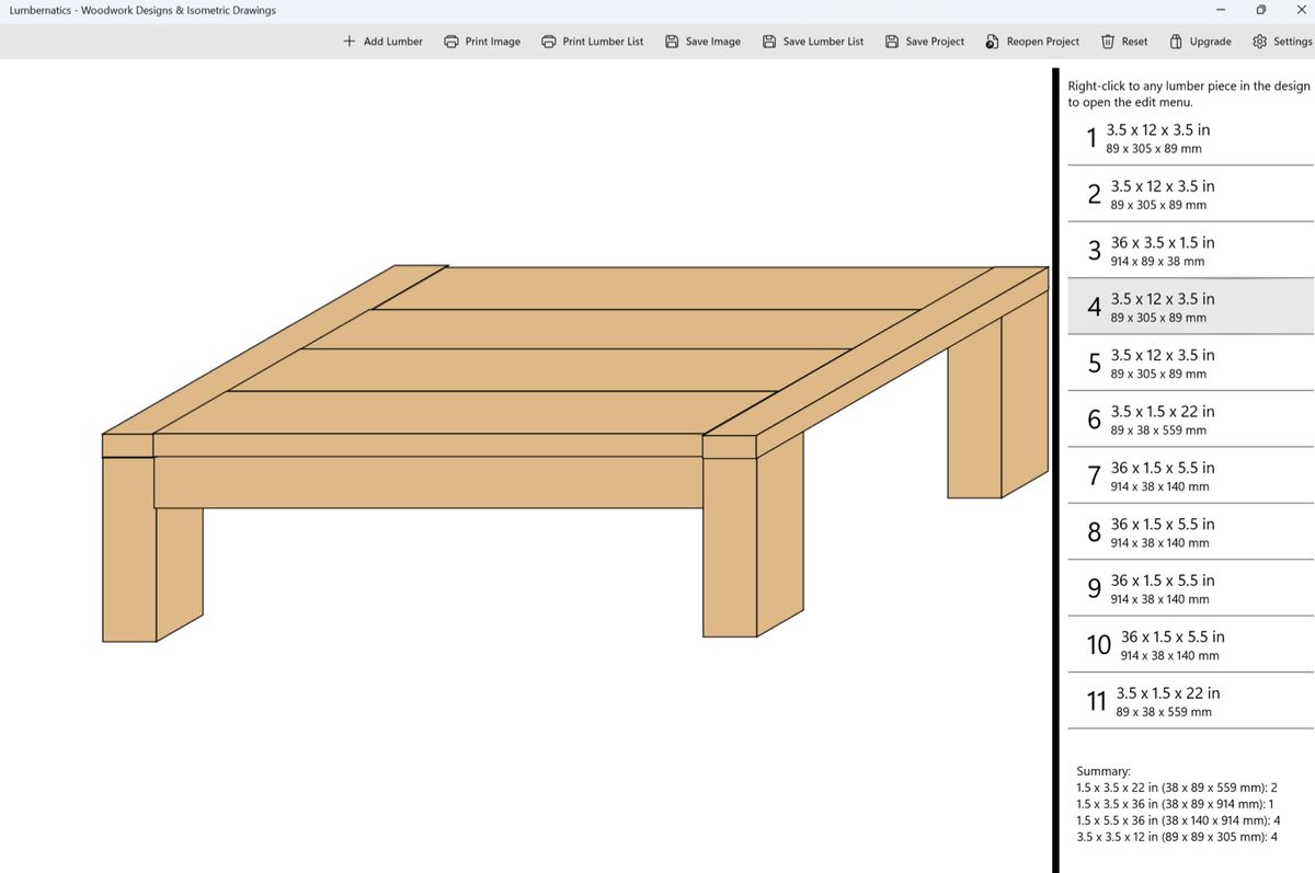 Пользоваться Lumbernatics 1.0.4 достаточно просто: после запуска открывается рабочее пространство с панелью инструментов сверху и областью проектирования в центре. Пользователь может добавлять деревянные элементы через контекстное меню или панель, настраивать их размеры, поворачивать и перемещать в трёхмерном пространстве. Все параметры деталей отображаются в правой части окна, где также формируется динамически обновляемый список компонентов. При изменении или удалении элементов список корректируется автоматически, минимизируя риск ошибок при расчёте объёмов. После завершения проектирования проект можно экспортировать или распечатать для использования в реальных условиях.
