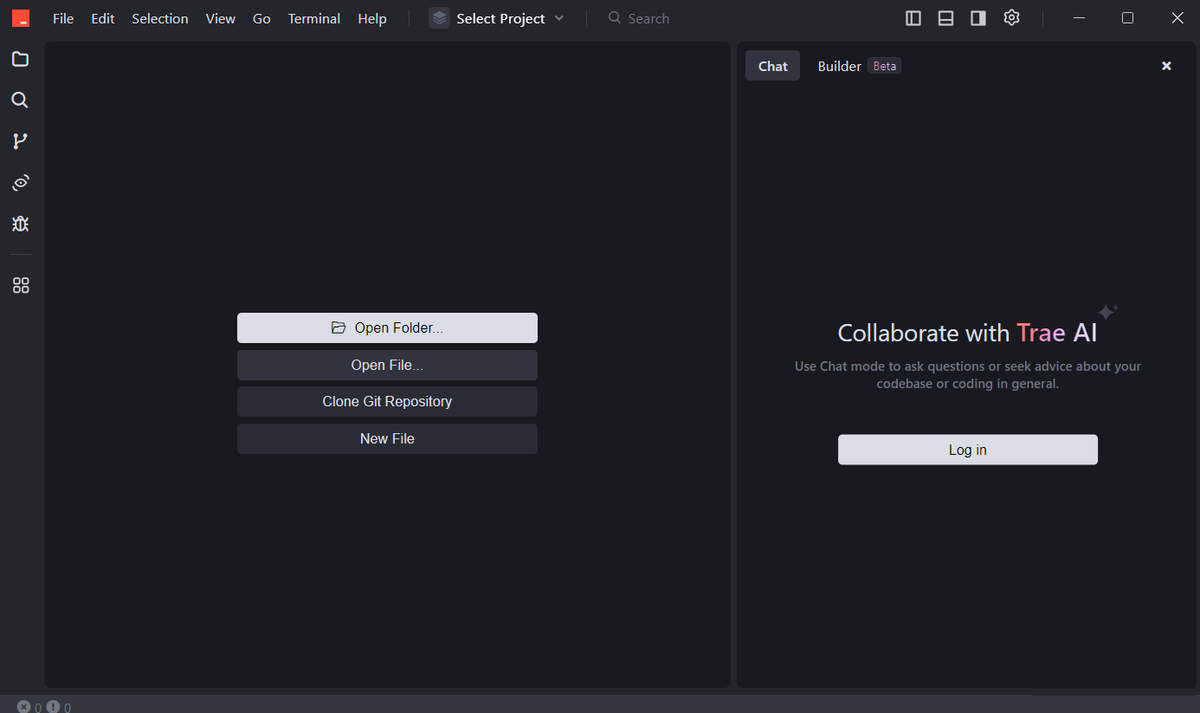 Trae представляет собой мощную среду разработки, ориентированную на интеграцию с искусственным интеллектом для повышения производительности. При запуске пользователю предлагается выбрать тему оформления, что позволяет сразу начать работу в комфортной визуальной среде. Интерфейс разделён на две части: слева — редактор кода, справа — панель чата с ИИ, где можно обсуждать логику, получать объяснения и даже исправлять ошибки.