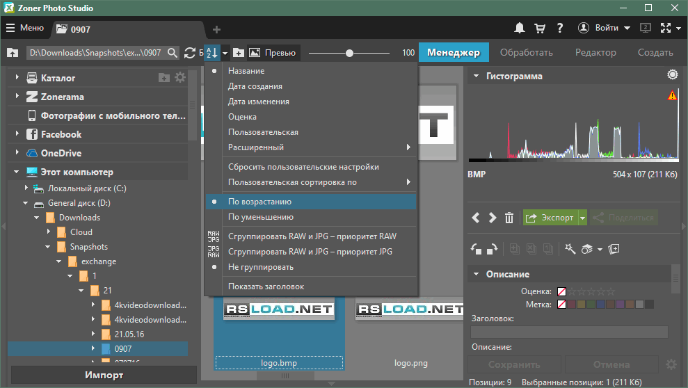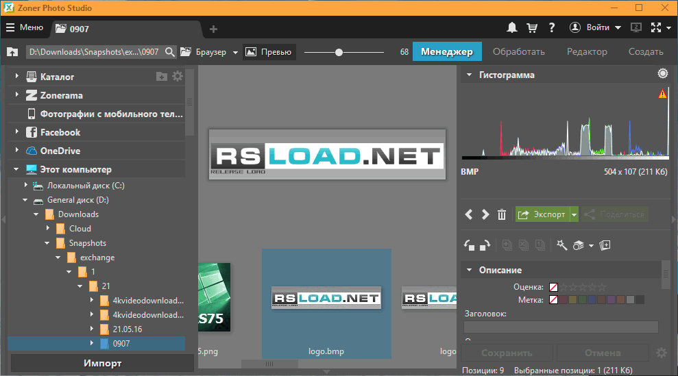- Высокая скорость работы с большими коллекциями фото и RAW-файлами