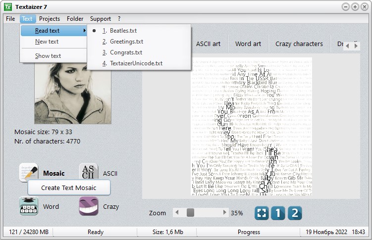 - Автоматический режим преобразования изображения в текстовую мозаику