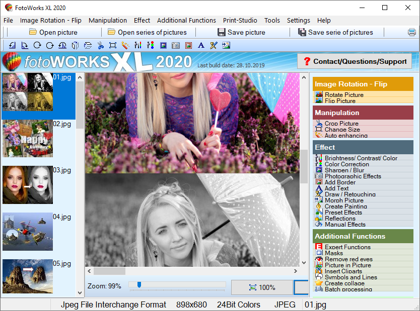 Использование программы не требует специальных навыков. После запуска доступно главное окно с панелью инструментов справа, где сосредоточены все основные функции — от изменения размера изображения до наложения теней и масок. Работа с несколькими фотографиями упрощена благодаря встроенной поддержке пакетного режима. Пользователь может регулировать параметры эффектов с помощью ползунков, получая визуальный отклик сразу на экране. Дополнительно можно просматривать внизу окна технические характеристики текущего изображения — разрешение, формат, размер файла и другую метаинформацию.
