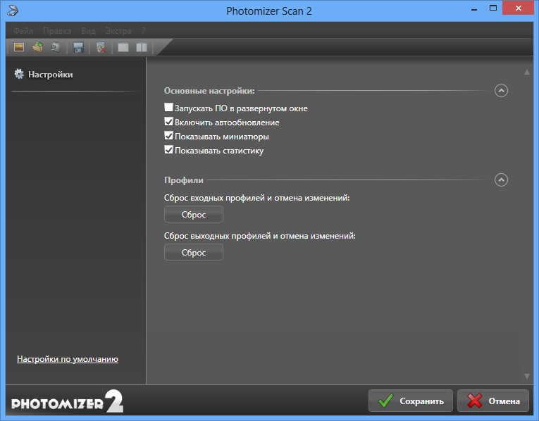 - Наличие предустановленных профилей для разных типов материалов — негативы, слайды, фотобумага