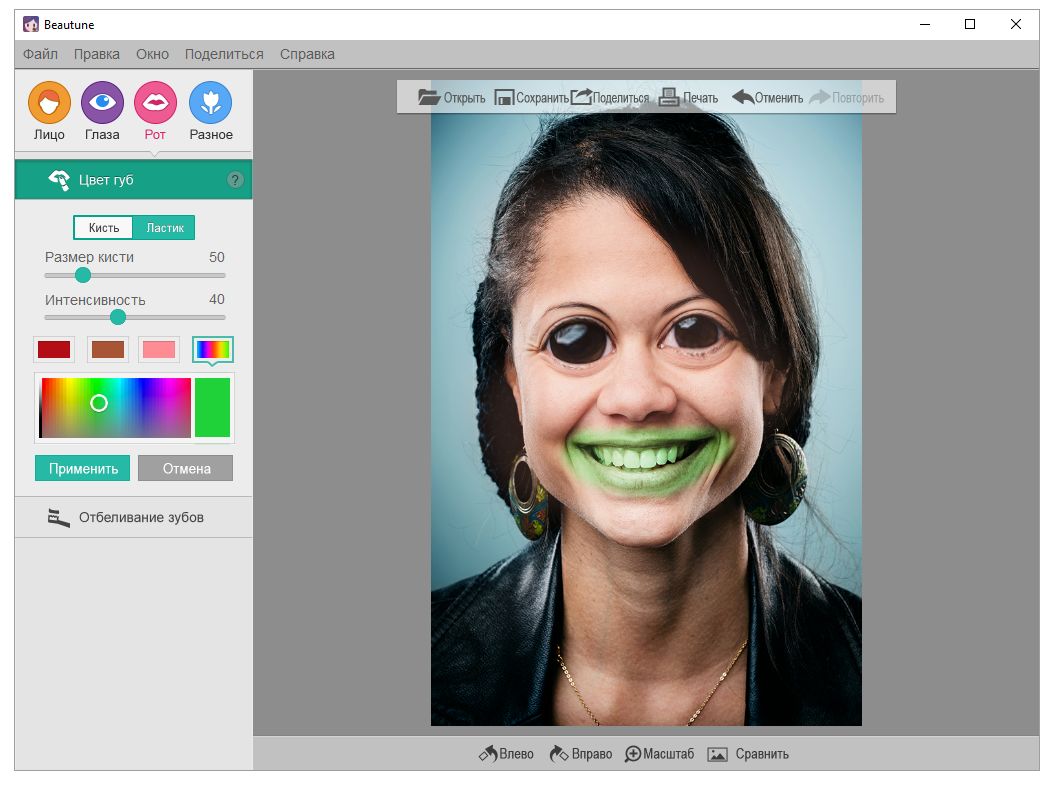 Пользоваться программой несложно: после запуска достаточно загрузить изображение, после чего инструменты станут доступны в боковой панели. Основной метод редактирования — выделение области с помощью кисти или точечного указателя, после чего применяются коррекции: разглаживание кожи, изменение яркости, контраста, насыщенности или геометрии лица. Для глаз предусмотрены отдельные регуляторы, увеличивающие их размер, добавляющие блеск и осветляющие белки. Аналогично работают параметры для губ — можно усилить их цвет, придать объём и подкорректировать форму. Изменения отображаются в реальном времени, что позволяет отслеживать эффект и избегать перебора. Перед сохранением результат можно сравнить с оригиналом, используя функцию быстрого переключения до и после. Программа поддерживает основные форматы изображений, включая JPG, PNG и BMP, и позволяет экспортировать результат с заданным качеством. Скачать Beautune можно в двух вариантах — полной установочной версии и портативной, не требующей инсталляции.