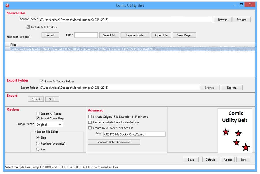 Использование Comic Utility Belt 1.4.0.74 не требует специальных навыков. После запуска приложения пользователь может открыть нужный файл с комиксом, просмотреть его содержимое и выбрать интересующие страницы для экспорта. Процесс извлечения осуществляется в несколько кликов, а настройки позволяют задать папку назначения и формат сохранения. Для продвинутых пользователей доступен режим командной строки, с помощью которого можно массово обрабатывать каталоги с комиксами без необходимости ручного управления. Также полезной функцией является фильтрация файлов — программа автоматически игнорирует неподдерживаемые или служебные файлы, что ускоряет работу с большими библиотеками.