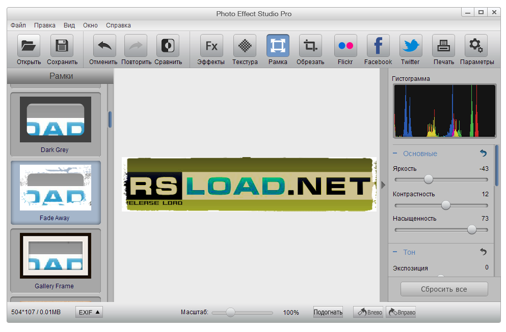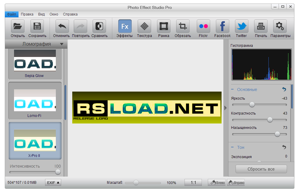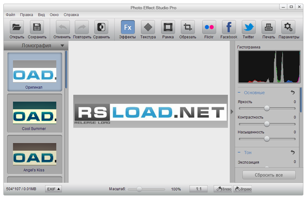- Интерфейс разделён на логические зоны: слева — выбор эффектов, справа — настройки яркости, контраста и насыщенности