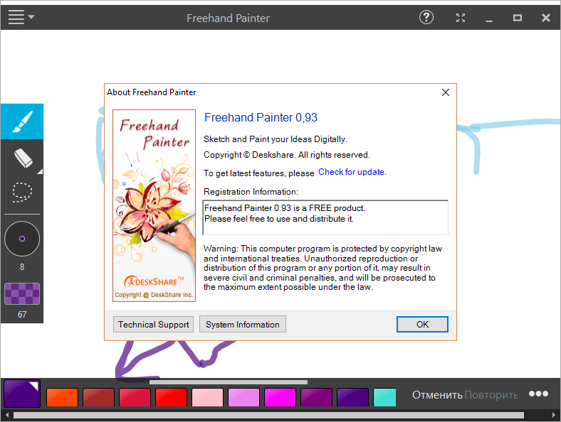 Freehand Painter разработана компанией DeskShare Incorporated как простое, но функциональное решение для тех, кто хочет экспериментировать с векторным рисованием. Софт использует основы векторной графики, что обеспечивает масштабирование рисунков без потери качества. Это особенно полезно при создании иллюстраций, схем или чертежей, где важна чёткость линий и точность форм.