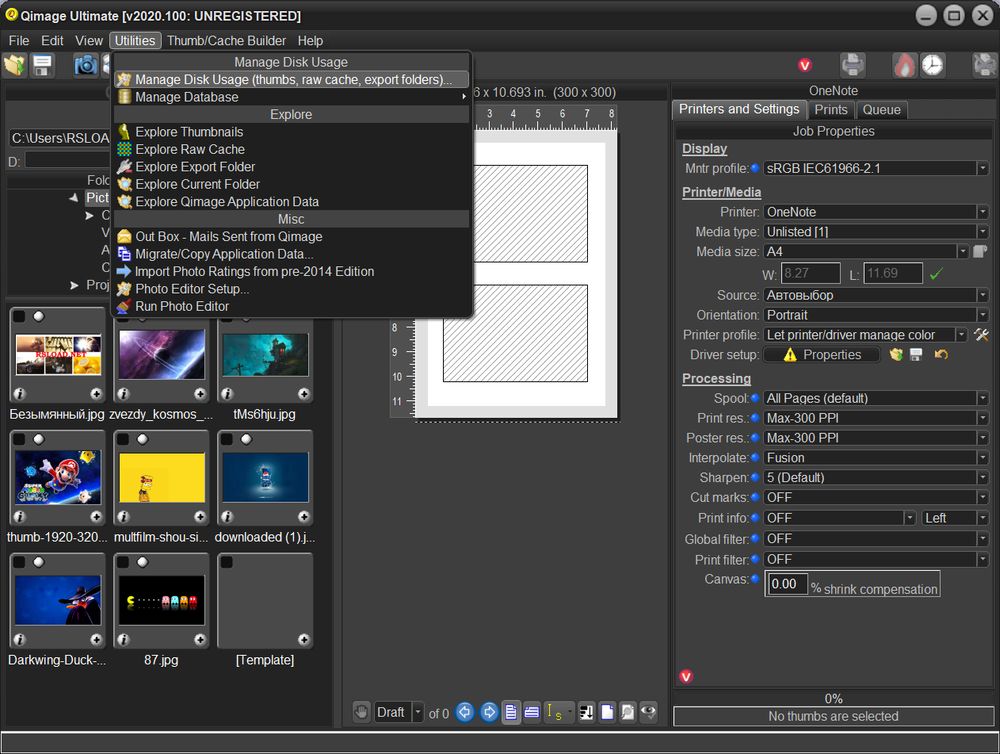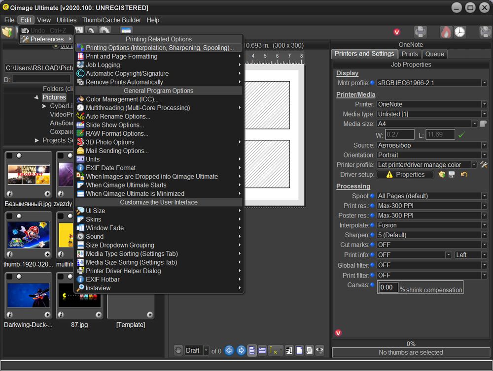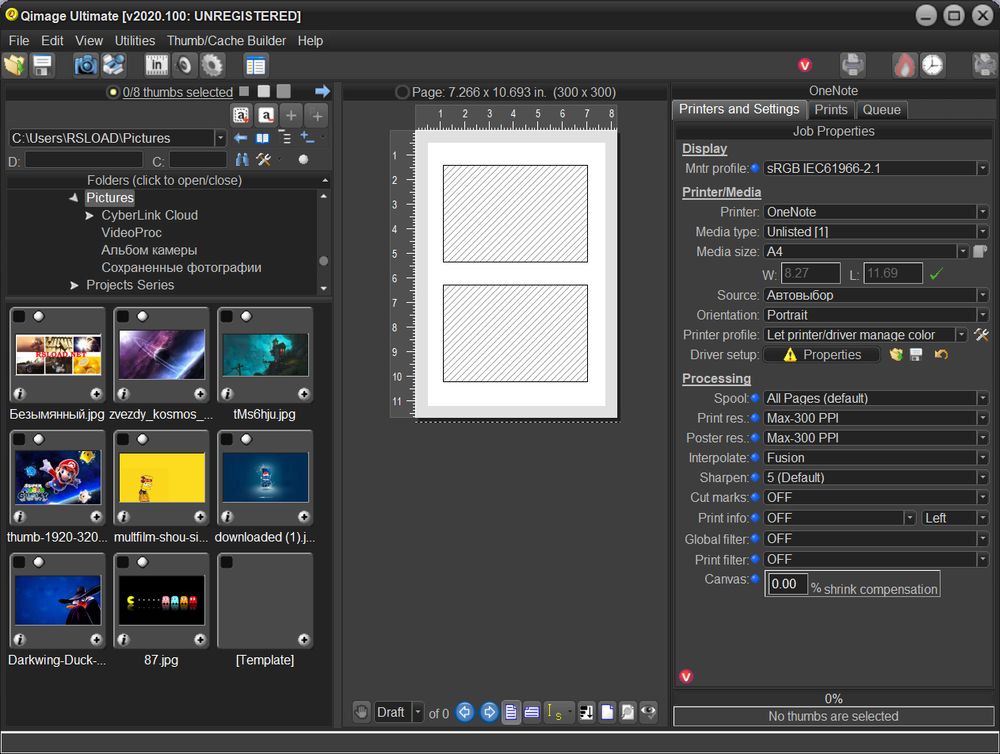 Qimage Ultimate разрабатывалась как инструмент для профессионалов и любителей, которым важно получить высокое качество вывода изображений на печать без потерь в детализации. Программа поддерживает широкий диапазон графических форматов, включая RAW, что делает её подходящей для обработки снимков, сделанных на цифровые зеркальные камеры. Интерфейс, хоть и ориентирован на английский язык, организован логично: слева — навигация по папкам, в центре — область предпросмотра миниатюр, справа — окно печати с настройками. Это позволяет быстро переключаться между файлами и визуализировать результат до отправки на печать.