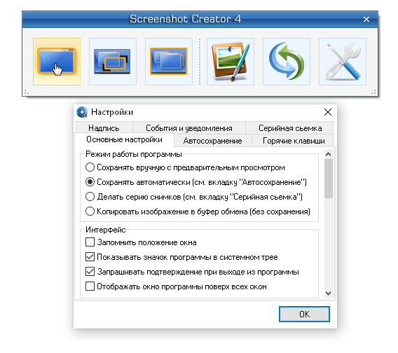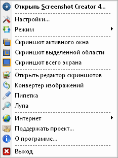 - Поддержка нескольких режимов захвата экрана: полный экран, активное окно, пользовательская область