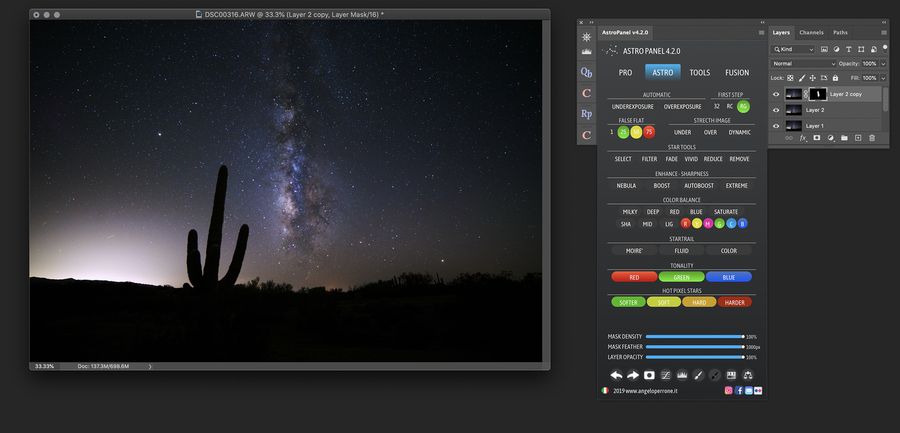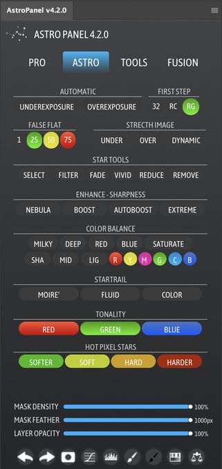 Astro Panel 6.0 — мощный инструмент для художников, фотографов и астрономов-любителей, желающих обрабатывать изображения ночного неба в Adobe Photoshop. Плагин интегрируется непосредственно в рабочее пространство программы и предлагает широкий набор функций, призванных улучшить качество снимков, сделанных в условиях низкой освещённости. Благодаря продуманной структуре панели все основные операции становятся максимально доступными и понятными.