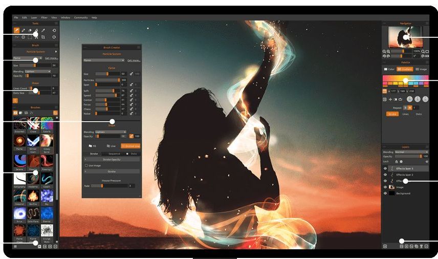Flame Painter 4.1.5 — это специализированное приложение для создания визуально насыщенных огненных эффектов и световых композиций без необходимости обладать профессиональными навыками графического дизайна. Программа подходит как для любителей, так и для профессионалов, которым необходимо быстро сгенерировать динамичные элементы вроде пламени, искр или светящихся следов. Благодаря интуитивному интерфейсу и гибким настройкам, Flame Painter позволяет легко имитировать процессы горения и свечения, применяя уникальные алгоритмы рисования.