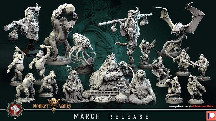 White Werewolf Tavern — это регулярные ежемесячные коллекции высококачественных 3D-моделей для печати, созданные специально для поклонников настольных ролевых игр и коллекционных миниатюр. Мартовский релиз 2022 года представляет тематическую серию «Долина обезьян», включающую 20 уникальных моделей, включая полные фигуры, бюсты и комплекты существ. Все файлы поставляются в формате STL, с предварительной поддержкой и проверкой на печать, что делает процесс создания миниатюр простым и надёжным.
