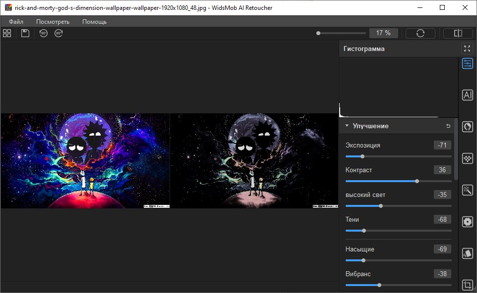 Использование WidsMob AI Retoucher не требует специальных навыков. После запуска приложения пользователь видит чистый и интуитивно понятный интерфейс, где основное пространство отведено под загруженное изображение. Справа расположены панели с гистограммой, параметрами улучшения и настройками, включая коррекцию яркости, контраста, насыщенности и уровня шумов. При переключении между вкладками с иконками становятся доступны режимы ретуши кожи, устранения дефектов и применения фильтров. Каждое изменение сразу отображается в режиме реального времени, что позволяет точно оценить результат. Пользователь может доверить коррекцию полностью системе с поддержкой ai, чтобы получить оптимальный баланс цвета, света и детализации.