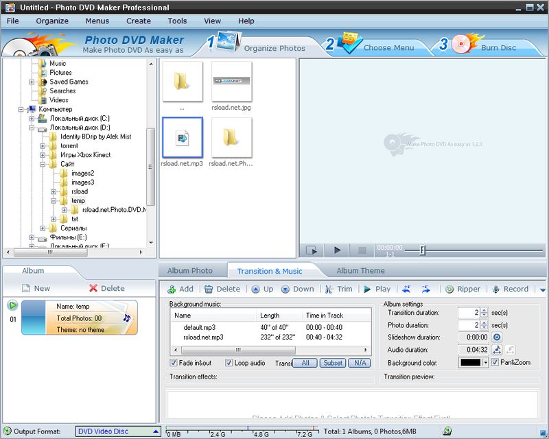 Photo DVD Maker позволяет не только объединять фото в единую композицию, но и сохранять результат в формате, пригодном для воспроизведения на любом экране.