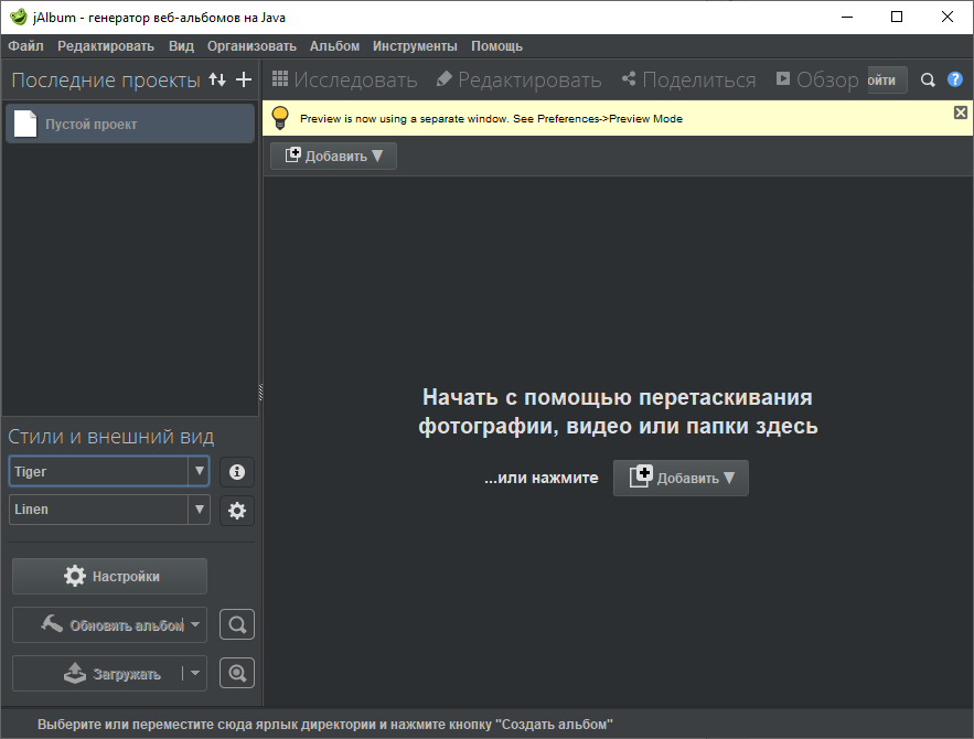 Использование JAlbum начинается с перетаскивания изображений в основное окно приложения. Далее выбирается шаблон, который можно кастомизировать по цветам, шрифтам, структуре и поведению элементов. Дополнительно доступно наложение логотипов, экспорт описаний из EXIF, настройка переходов и управления навигацией. После настройки альбом можно опубликовать через внутренний сервер, FTP, или экспортировать в каталог для ручной загрузки. JAlbum 19.0, включая x64-версию, работает без задержек даже с большими коллекциями фото.