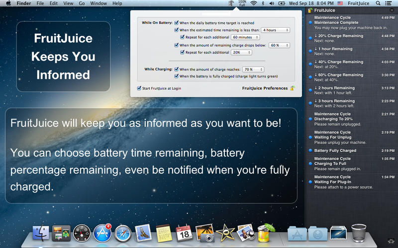 FruitJuice v2.5.2 разработана компанией BatteryProject как специализированное приложение для владельцев MacBook, iBook и других портативных компьютеров Apple. Основная цель утилиты — помочь пользователю эффективнее управлять энергопотреблением устройства и продлить срок службы аккумулятора за счёт своевременных уведомлений и советов. Программа совместима с операционными системами семейства OS X начиная с версии 10.8 и требует наличия 64-битного процессора. Благодаря небольшому размеру файла — всего 8 МБ — установка не занимает много времени и не нагружает систему.