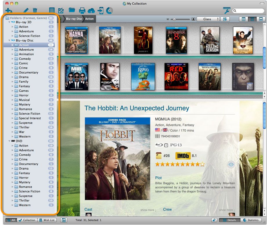 Использование Collectorz.com Movie Collector Pro не требует специальных навыков. После запуска приложения пользователь может начать добавлять фильмы, вводя название вручную или подключив сканер штрихкода, который моментально определит диск. Далее система автоматически подтягивает всю сопутствующую информацию: обложку, аннотацию, состав съёмочной группы, пользователям доступны рейтинги от зрителей и критиков. Коллекцию можно структурировать по папкам, выделять избранные картины, создавать списки для просмотра и экспортировать данные в другие форматы. Интерфейс остаётся понятным даже при большом объёме добавленного контента.