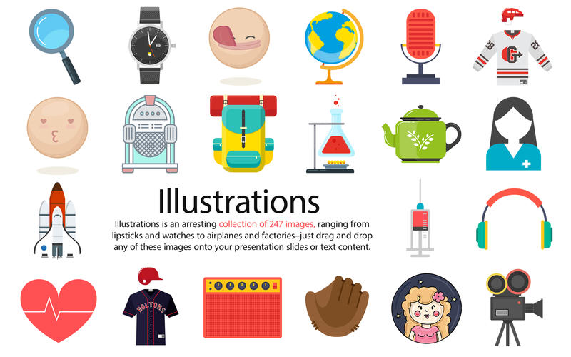 - Более 2000 иллюстраций, сгруппированных по категориям для быстрого поиска