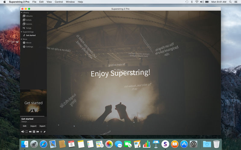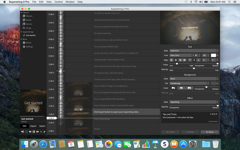 Superstring функционирует как удобное решение для тех, кто хочет визуализировать музыкальные композиции с отображением текста в реальном времени. Приложение поддерживает работу с различными аудиофайлами, позволяя загружать их напрямую в проект. Создание лирического видео происходит в несколько простых шагов: добавление трека, ввод и синхронизация текста, настройка визуальных эффектов и экспорт готового ролика. Программа совместима с операционными системами Mac OS X, начиная с версии 10.8, и занимает относительно мало места на диске — всего около 65.84 MB.