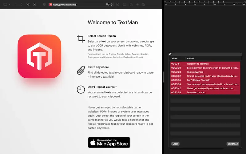 TextMan 1.7 — это современное приложение для macOS, позволяющее быстро извлекать текст с экрана с помощью технологии оптического распознавания символов. Программа поддерживает множество языков, включая английский, немецкий, французский, испанский, итальянский, португальский и китайский. Достаточно выделить область экрана, как распознанный текст моментально попадает в буфер обмена.