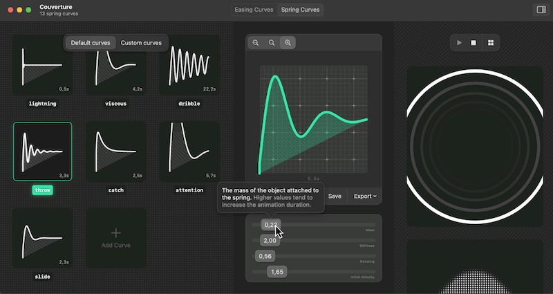 Couverture работает с так называемыми timing curves — математическими функциями, определяющими, как изменяется параметр анимации во времени. Благодаря этому можно добиться естественного вида движения элементов. Инструмент обеспечивает точность настройки, визуализацию кривых и мгновенный предпросмотр результатов. Он особенно полезен при создании сложных интерфейсов, где важна плавность и гармоничность анимаций.