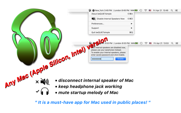 beQUIETsimple 3.45 — небольшая утилита для macOS, предназначенная для полного отключения встроенных динамиков устройства Apple. Программа позволяет блокировать звук с внутренних колонок, не отключая при этом аудиовыход через разъем для наушников. Идеальное решение для пользователей, которым важно сохранять тишину в общественных местах, не теряя при этом возможность прослушивать звук через внешние устройства.