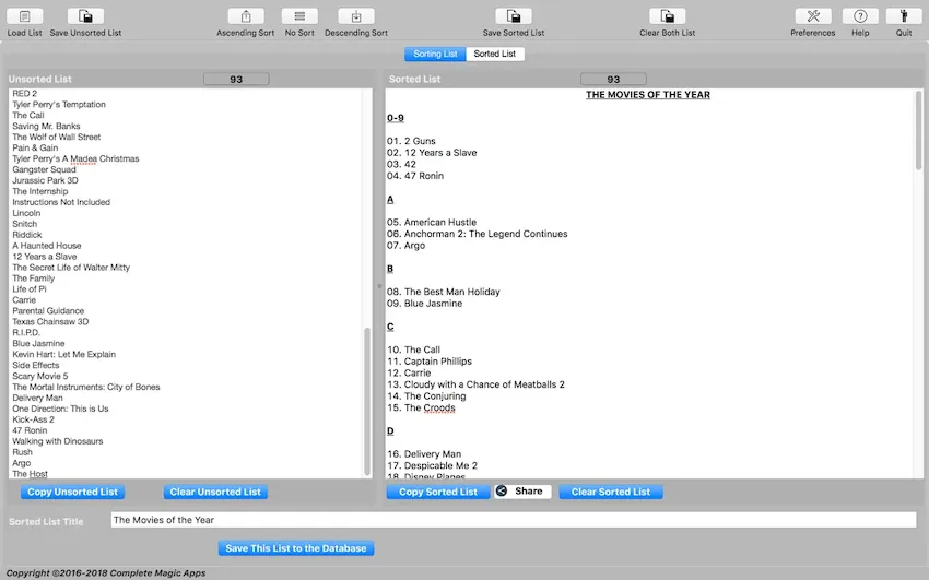 Magic Sort List 3.4.8 — это утилита для эффективной сортировки и обработки данных из электронных таблиц, разработанная под macOS. Программа помогает привести списки к аккуратному виду, устраняя дубликаты, пустые строки и предоставляя гибкие возможности сортировки. Несмотря на узкую специализацию, инструмент может стать полезным помощником при работе с большими объёмами текстовой и числовой информации. Поддержка интеллектуальной сортировки и автоматической нумерации делает обработку данных максимально комфортной. Программа проста в использовании и не требует глубоких знаний для выполнения базовых задач.