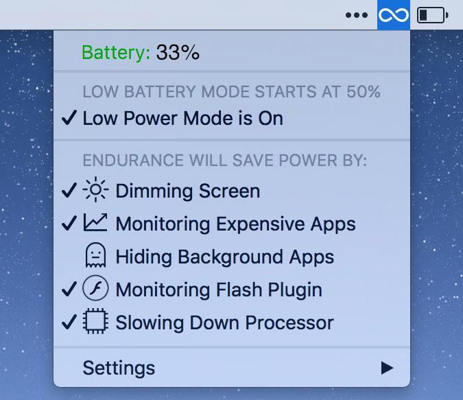 Endurance 3.2.6 — это утилита для macOS, разработанная для продления времени автономной работы ноутбука за счёт автоматической оптимизации энергопотребления. Программа работает в фоне и предлагает гибкие настройки управления производительностью и расходом заряда аккумулятора. Благодаря лёгкому интерфейсу и малому объёму, Endurance подходит для повседневного использования без нагрузки на систему.