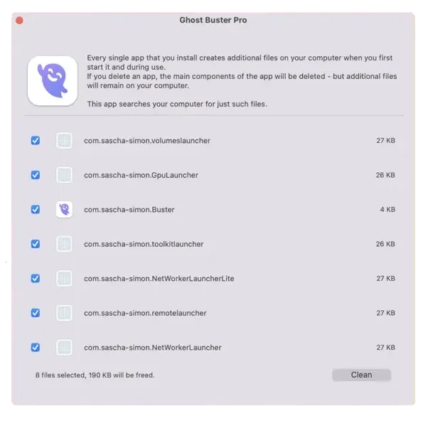 Ghost Buster Pro 3.4.5 — утилита для macOS, предназначенная для поиска и удаления остаточных файлов от деинсталлированных приложений. Программа быстро сканирует систему, выявляя «цифровой мусор», и помогает освободить дисковое пространство. Пользователи могут легко поддерживать macOS в чистоте, не прибегая к ручному поиску скрытых файлов.
