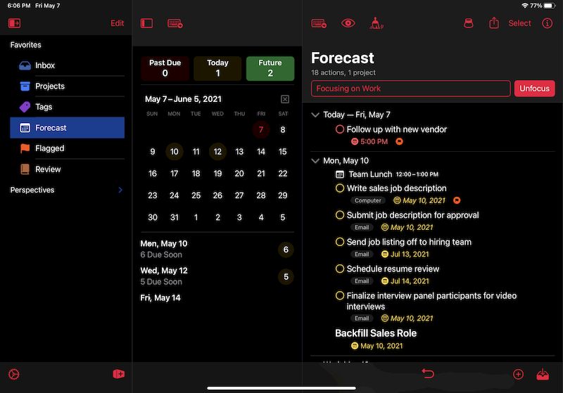 Работа с OmniFocus Pro 4.5.2 интуитивно понятна благодаря логичной структуре и чистому дизайну. Пользователь может создавать задачи, присваивать им даты исполнения, устанавливать зависимости и назначать теги. Благодаря версии Pro становится доступным расширенный функционал, включая настраиваемые перспективы — это фильтрованные представления, которые показывают только те задачи, которые соответствуют указанным критериям. Например, можно вывести все дела, связанные с «работой» и имеющие высокий приоритет. Улучшенный вид «Перспективы» делает планирование более гибким. Также доступно объединение задач и календарных событий в едином дневном обзоре. Повторяющиеся задачи можно настроить с точностью до дня недели, месяца или использовать сложные правила повтора.