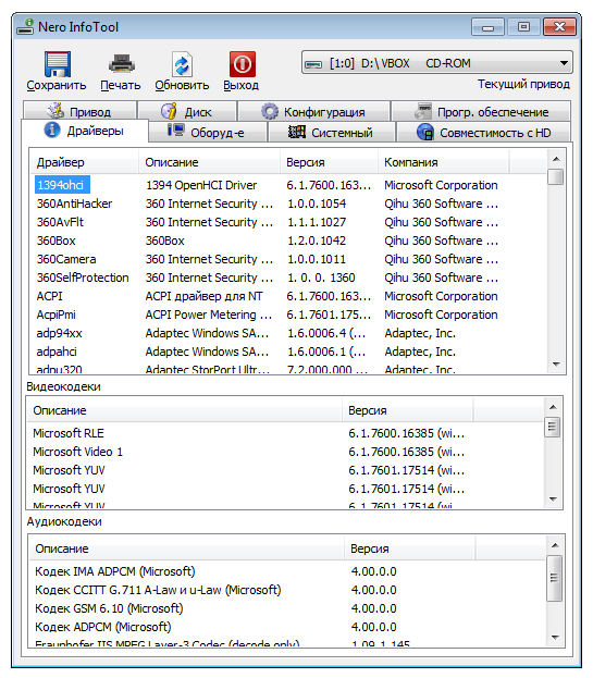- Программа отображает информацию о всех устройствах чтения и записи дисков, включая поддержку кодеков и протоколов.