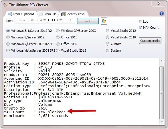 The Ultimate PID Checker 1.2.0.606 — это компактное приложение для анализа и проверки лицензионных ключей продуктов Microsoft. Программа помогает определить тип ключа, его статус и оставшееся количество активаций, особенно полезно при работе с MAK-ключами. Утилита не требует установки и поддерживает широкий диапазон операционных систем, включая Windows XP, 7, 8 и Server-версии.