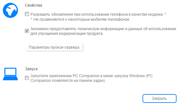 Работа с Sony PC Companion