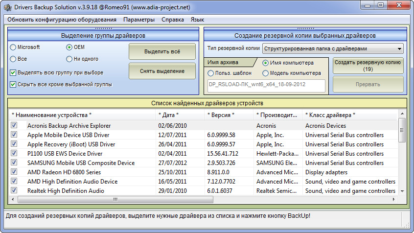 Работа с Drivers BackUp Solution