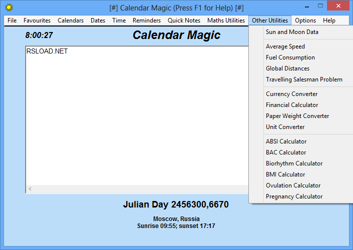 После запуска программы пользователь может сразу приступить к настройке интерфейса и выбору предпочтительного формата календаря. Для удобства предусмотрено отображение сразу двух месяцев, что полезно при планировании академического или финансового периода. Пользователь может выбирать страну и соответствующий календарный формат, включать показ религиозных праздников или использовать встроенный конвертер дат. Все данные, включая заметки и события, можно быстро сохранить и в дальнейшем восстановить при необходимости. Также доступны дополнительные утилиты, такие как математический калькулятор и таймер.