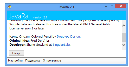 JavaRa 2.6 — это компактная, портативная утилита для быстрого обновления и удаления Java Runtime Environment. Программа не требует установки, работает в пару кликов и поддерживает русский интерфейс. Её основное преимущество — простота и эффективность при работе с устаревшими версиями Java.