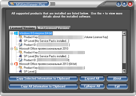 MSKeyViewer Plus v2.5.0 — это компактная и эффективная утилита, позволяющая просматривать лицензионные ключи программных продуктов, установленные пакеты обновлений, идентификаторы приложений и выявлять нелицензионные копии программ в системе. Инструмент функционирует в портативном режиме, не требует установки и совместим с различными версиями операционных систем и офисных пакетов. С его помощью можно быстро получить доступ к важной информации о лицензировании и конфигурации установленного программного обеспечения.