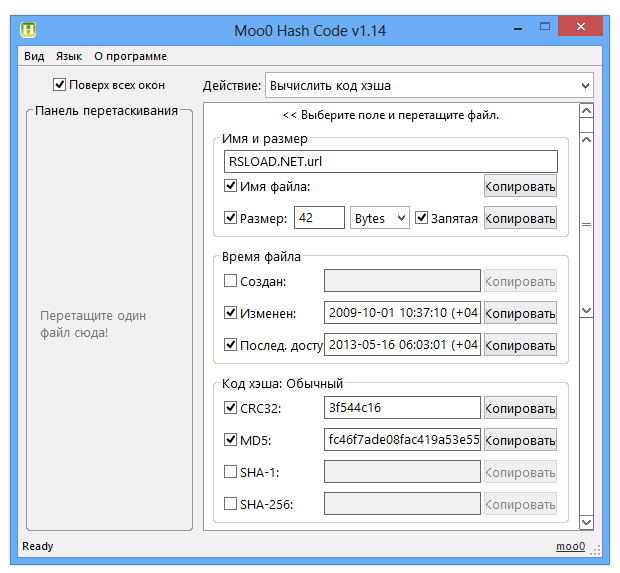 - Возможность перетаскивания файлов в окно программы для мгновенного вычисления хеша