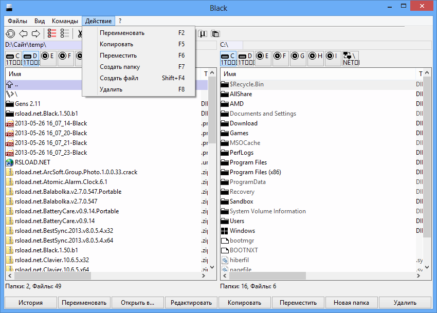 После запуска программы пользователь видит две панели, между которыми легко переключаться с помощью клавиш Tab или мыши. В левой части отображается содержимое одного каталога, в правой — другого. Такой подход ускоряет процесс копирования и перемещения файлов. Через контекстное меню доступны команды «открыть», «переименовать», «удалить», «создать папку» и другие. Поддерживаются стандартные сочетания клавиш, например, Ctrl+C / Ctrl+V для копирования. Программа позволяет просматривать атрибуты файлов, скрывать или отображать скрытые элементы, а также быстро переходить к системным директориям. Интерфейс остаётся стабильным даже при работе с большим количеством файлов. Black не создаёт лишних процессов в фоне и не замедляет работу системы.