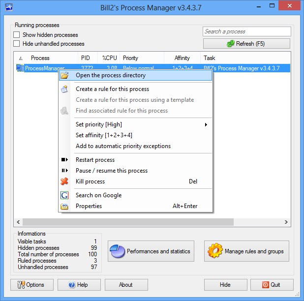 Использование Bill2’s Process Manager не требует специальных знаний. После запуска программа отображает список всех активных процессов, аналогично стандартному диспетчеру, но с более широкими возможностями. Пользователь может в один клик завершить процесс, приостановить его выполнение, изменить приоритет или открыть папку, в которой расположен исполняемый файл. Также доступен контекстный поиск через браузер — достаточно щёлкнуть правой кнопкой мыши, чтобы найти информацию об интересующем процессе. Для опытных пользователей реализована фильтрация и сортировка по различным критериям, включая потребление процессора и памяти.