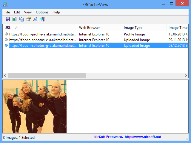 FBCacheView 1.23 Rus — это бесплатная портативная утилита от разработчика Nir Sofer, предназначенная для анализа кэшированных данных браузеров. Программа сканирует временные файлы, сохранённые при посещении Facebook, и отображает все изображения, которые были загружены во время сёрфинга. Это могут быть как профильные фотографии пользователей, так и картинки с постов, обложки, а также изображения, размещённые на других сайтах, но просмотренные в контексте Facebook.