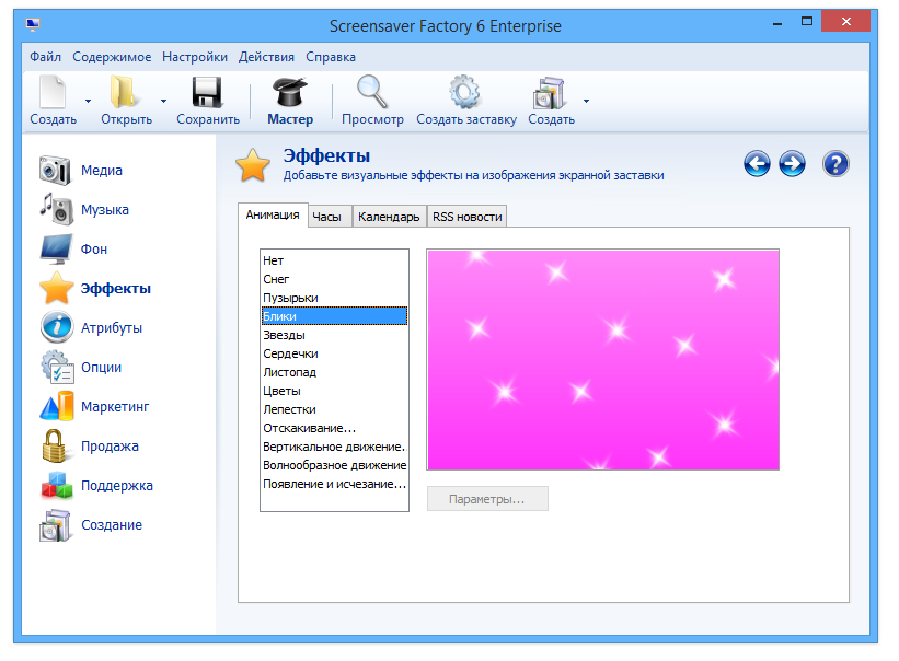 - Поддержка создания заставок из фото, видео и SWF-анимации