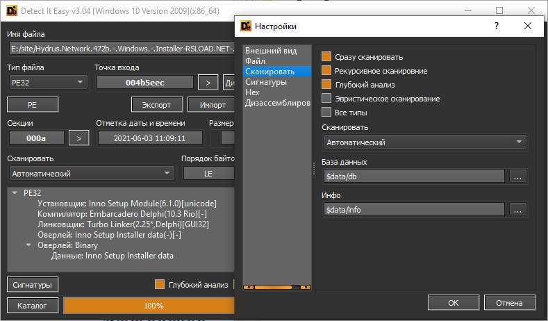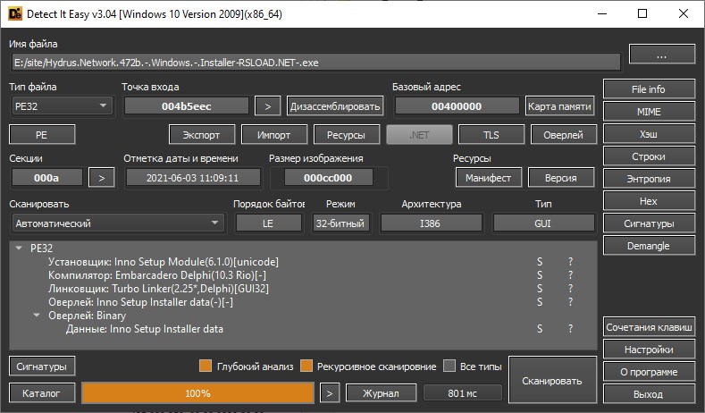 Утилита Detect It Easy 3.10 — это мощный инструмент для анализа исполняемых файлов, позволяющий определить тип компилятора, упаковщика или протектора. Программа доступна в портативной версии, поддерживает x64 и совместима с Windows XP и более поздними системами. С её помощью можно быстро идентифицировать содержимое бинарных файлов и получить детальную информацию о структуре.