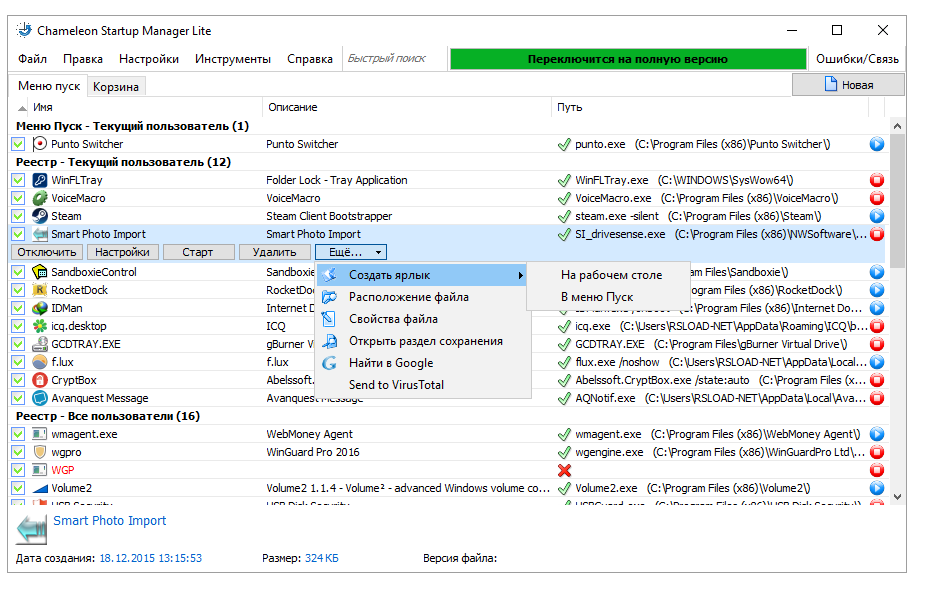 Chameleon Startup Manager Lite разработана компанией NeoSoft Tools и предназначена для управления программами, запускаемыми при старте операционной системы. Утилита анализирует записи в реестре, отображает автозагрузку для текущего пользователя и всех пользователей, а также включает отдельную категорию для системных служб. Это позволяет получить полный контроль над тем, какие процессы стартуют вместе с Windows. Программное обеспечение работает стабильно и не требует высоких системных ресурсов.