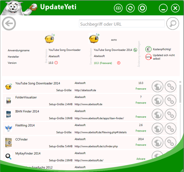 UpdateYeti Plus 2019 3.02 — утилита для автоматического поиска устаревших программ и их обновления, разработанная компанией Abelssoft. Приложение сканирует установленное ПО, определяет доступные обновления и позволяет пользователю выбрать, какие из них установить. Программа не требует сложной настройки и работает в облегчённом режиме, не нагружая систему.