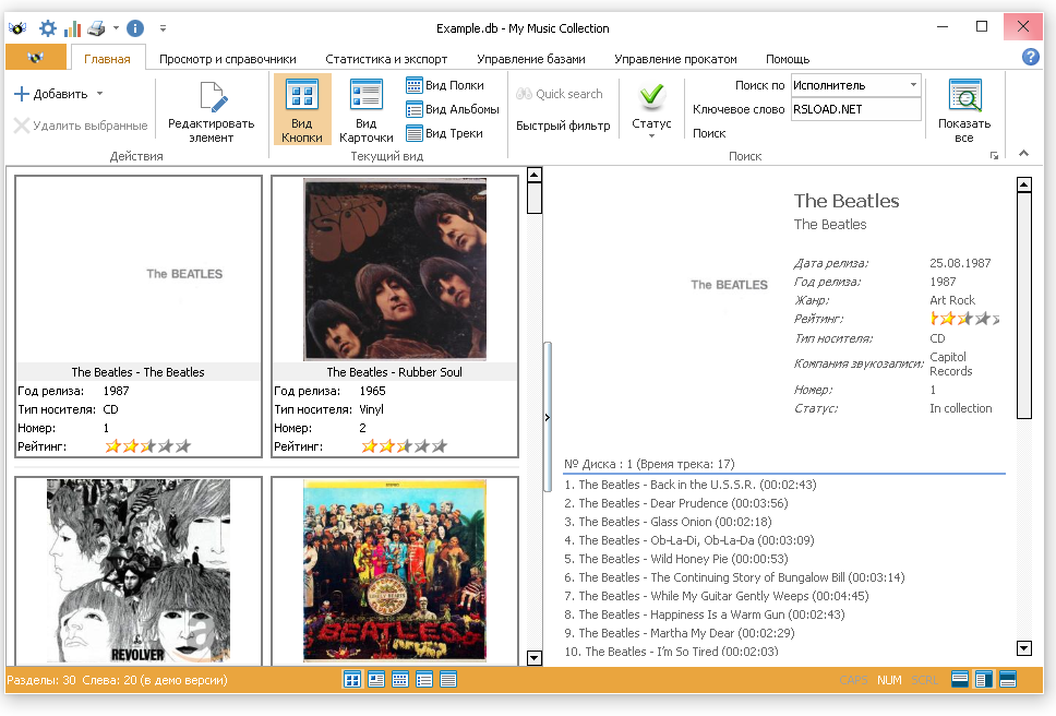 Запуск приложения начинается с создания новой базы данных, где пользователь указывает папки с музыкальными файлами. Программа сканирует содержимое и автоматически извлекает данные: название трека, исполнитель, альбом, год выпуска и жанр. Если информация отсутствует, пользователь может вручную добавить недостающие сведения, включая обложки и тексты песен. Также доступна функция проверки музыкальной коллекции через онлайн-базу, что значительно упрощает процесс каталогизации. После формирования базы можно применять фильтры по жанрам, датам, рейтингу или формату носителя, создавая тематические подборки. Управление коллекцией осуществляется через дерево категорий, что усиливает контроль над структурой библиотеки. Функция экспорта позволяет сохранить всю информацию в виде таблиц или отчетов для внешнего использования.