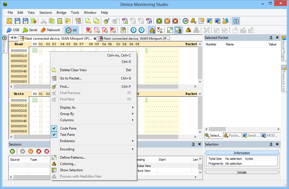 Network Monitor — это профессиональный инструмент для детального наблюдения за сетевой активностью на уровне пакетов. Программа фиксирует все данные, передаваемые через сетевой интерфейс, включая входящий и исходящий трафик. Она поддерживает захват полных сессий обмена информацией между хост-компьютером и любыми сетевыми ресурсами, что позволяет проводить глубокий анализ протоколов и поведения приложений. Решение активно используется в целях диагностики, тестирования и обеспечения безопасности сетевых систем.