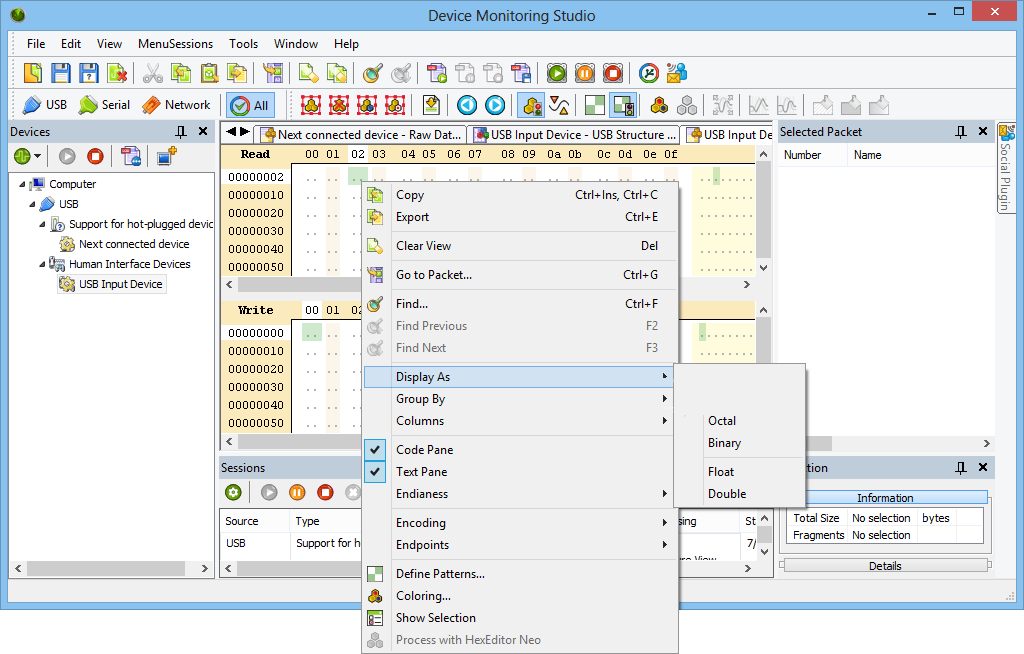 - Оснащена удобным деревом подключённых устройств с детализацией по дескрипторам и параметрам подключения.